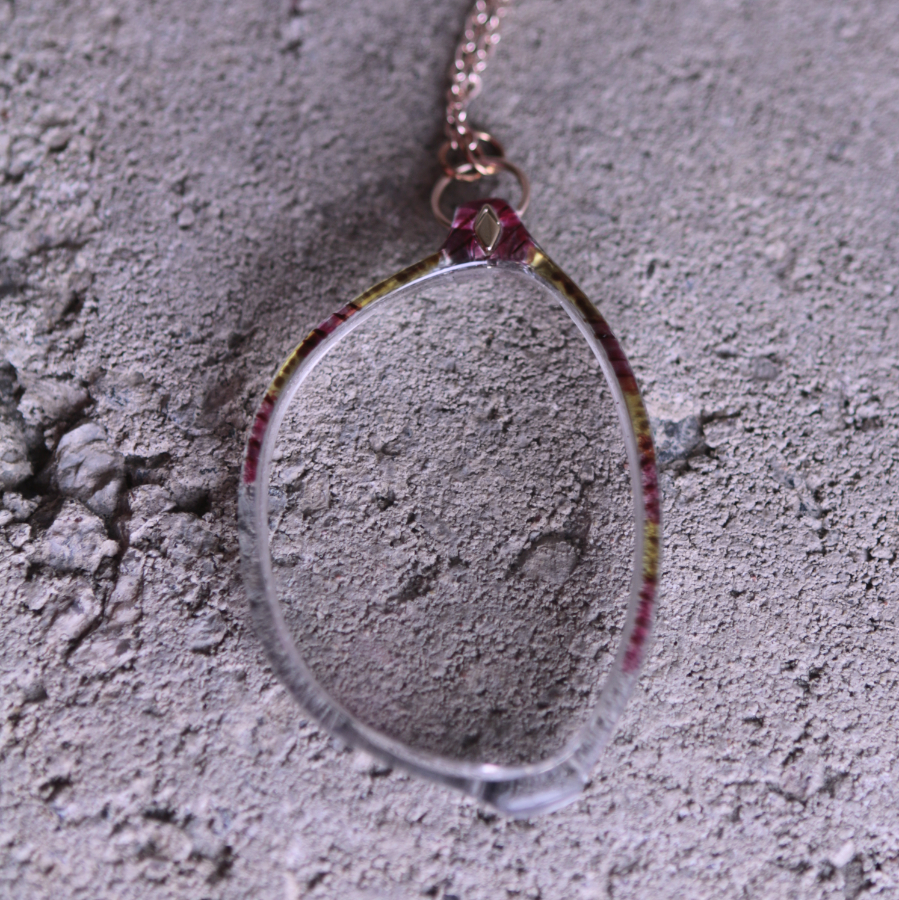 Ekologinen, kaunis ja käytännöllinen kaulakoru kierrätysmateriaaleista. Silmälasin suurentava linssi yhdistettynä ruusukullattuun, nikkelittömään ketjuun. Linssin kehys on kaunis yhdistelmä raidallista vaaleanpunaista ja keltaista.