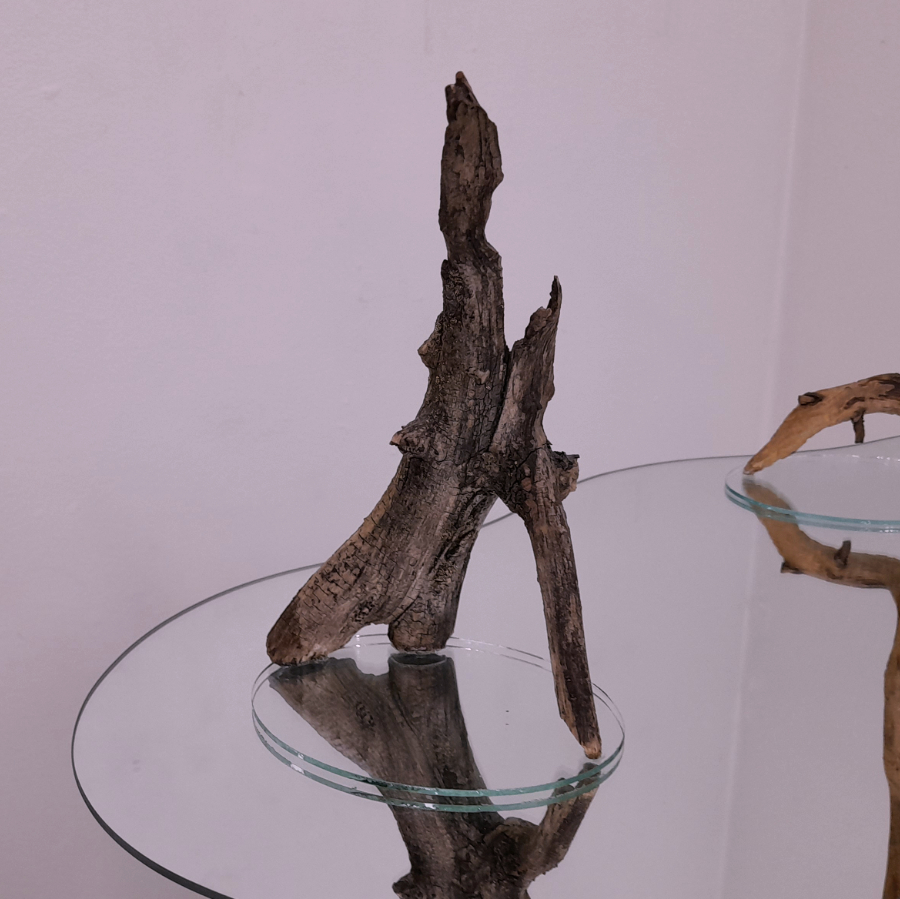 Veistoksen olen luonut yhteistyössä metsän kanssa. Kuljen metsässä, poimin maasta hienoja oksia. Kiinnitän oksan sellaisenaan, luonnon muovaamana alustalleen. Pyrin siihen, että katsoja näkee saman hahmon kuin minä.