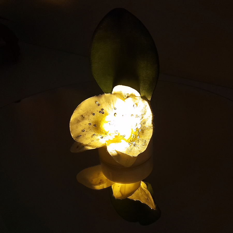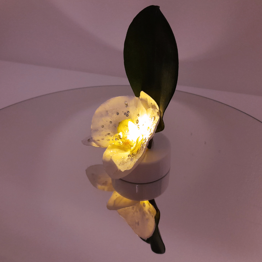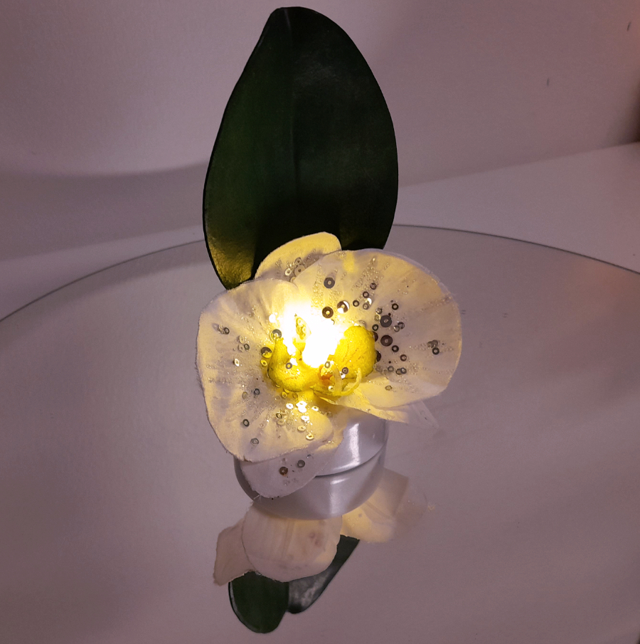 Valokukka on loistava lahja hämärän aikaan. Valokukka on ekologinen ja ainutlaatuinen lahja ystävänpäivänä. Tämä valokukka on led-kynttilän ja orkidea- tekokukan yhdistelmä. Tekokukan valkoisissa terälehdissä on kimaltavia glitterikoristeita. Tekokukka on alun perin kirpputorilta eli kierrätysmateriaalia.