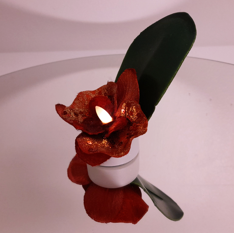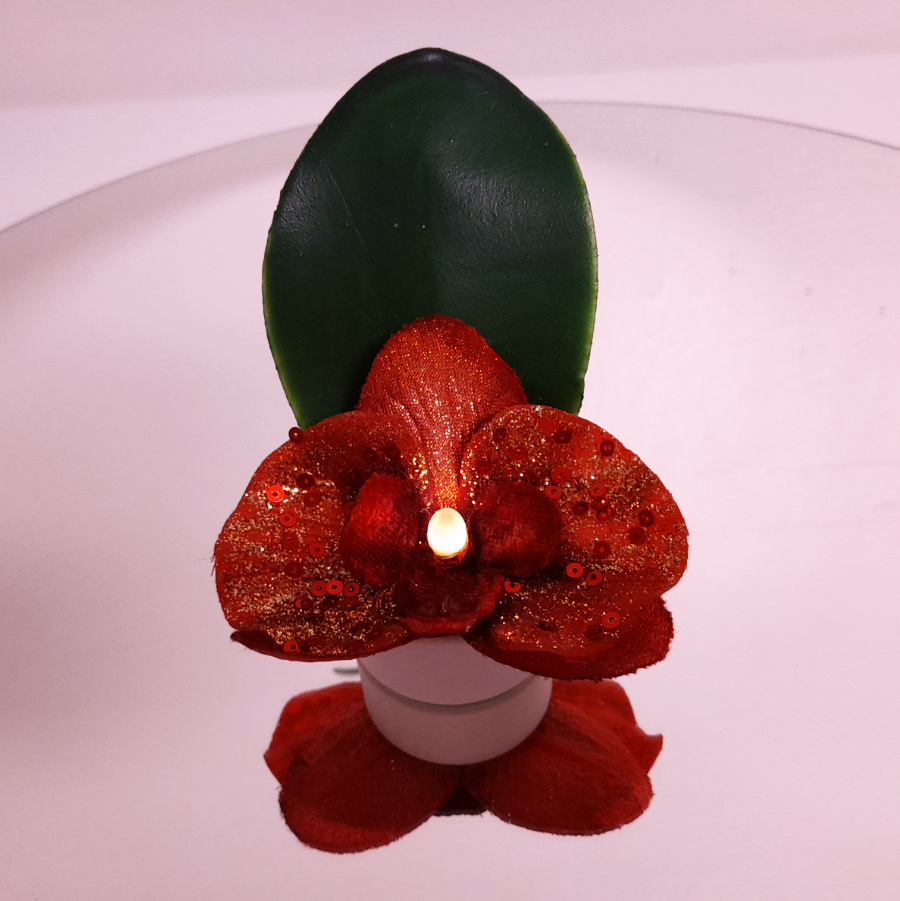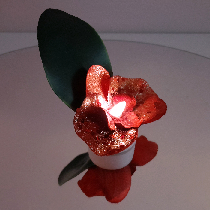 Valokukka on loistava lahja hämärään vuodenaikaan ja ystävänpäväksi! Valokukka on led-tuikun ja tekokukka- orkidean yhdistelmä. Orkidean terälehtissä on kauniita glitteri- koristeita. Tekokukka on alunperin kirpputorilta.
