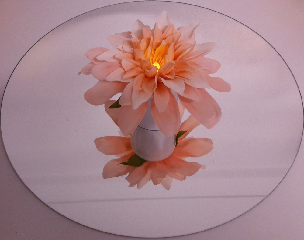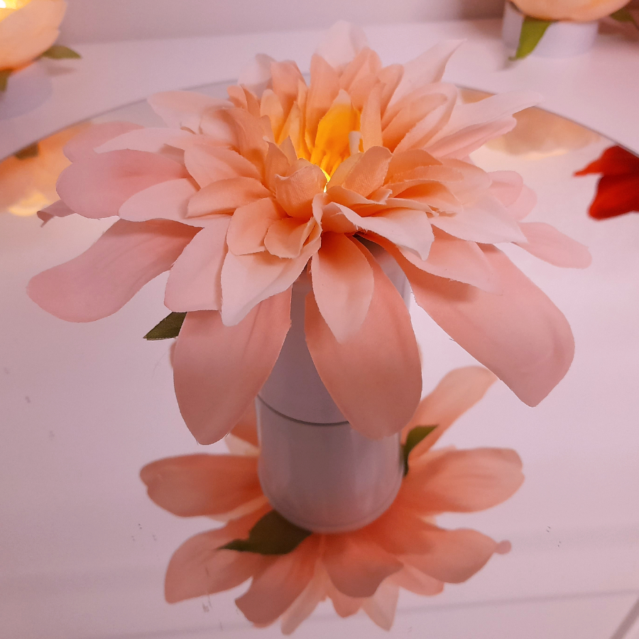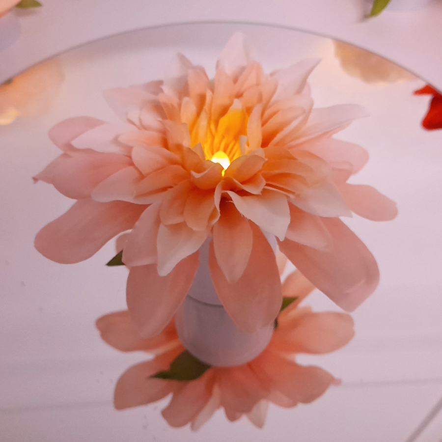 Valokukka on loistava ystävänpäivälahja! Yksilöllinen ja ekologinen tunnelmavalo, terveellinen tavallisen kynttilän korvaaja. Valokukka on tekokukan ja led- hautakynttilän yhdistelmä. Hautakynttilään rakennettu valokukka kestää pakkasta ja sen voi laittaa myös ulos esimerkiksi lyhtyyn, vaikka haudalle. Valokukan terälehdet ovat hempeän vaaleanpunaiset. Tekokukka, josta valokukka on rakennettu, on peräisin kirpputorilta.